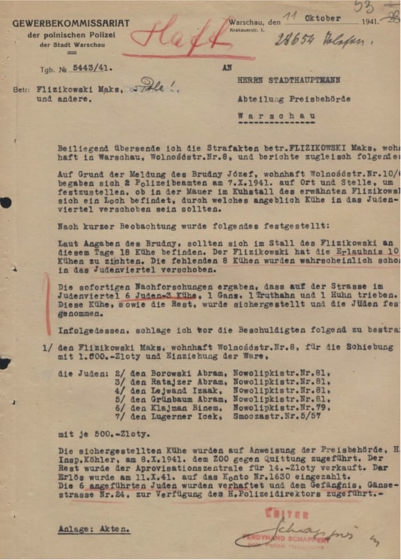 Dobrym przykładem jest przechowywana w Archiwum Państwowym w Warszawie dokumentacja sprawy Maksymiliana Flizikowskiego[1], prowadzącego na ul. Wolność 8, w 1940 r. przemianowanej na Zegarmistrzowską, krowiarnię z 10 zwierzętami. Pochodził z okolic Torunia, skąd prawdopodobnie został wraz z rodziną wysiedlony do Generalnego Gubernatorstwa. Możliwe że krowi interes, bynajmniej nierzadki w międzywojennej Warszawie[2], przejął lub wydzierżawił od jakiegoś Żyda. W pierwszym roku okupacji był to proceder powszechny, a dla całkowicie spauperyzowanych wysiedleńców z Polski zachodniej często stanowiący szansę na przetrwanie. Nie wiemy jaki był stosunek Flizikowskich do Żydów, ale na współpracę niejako skazywały ich warszawskie adresy: mieszkali na ul. Chłodnej 50, dosłownie na granicy getta, a ściana krowiarni przylegała do położonej już po stronie żydowskiej nieruchomości Nowolipki 81. Trudno założyć, żeby tej drugiej okoliczności nie wykorzystywano do szmuglu, zwracając tym uwagę polskich sąsiadów. Od początku października 1941 r. mieszkający na sąsiedniej posesji (Wolność 10) Polak Józef Brudny, z zawodu siodlarz, obserwował oborę, odnotowując sprowadzane do niej krowy. Kiedy 7 października 1941 r. zauważył, że przywieziono także piasek i wapno, zawiadomił niemiecką policję.