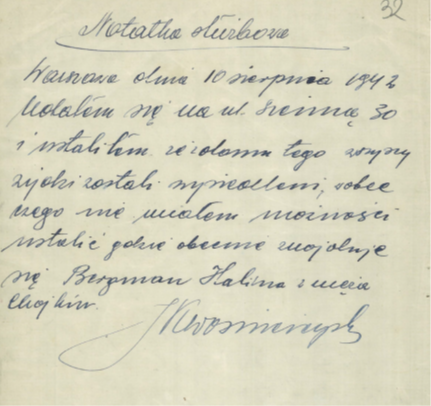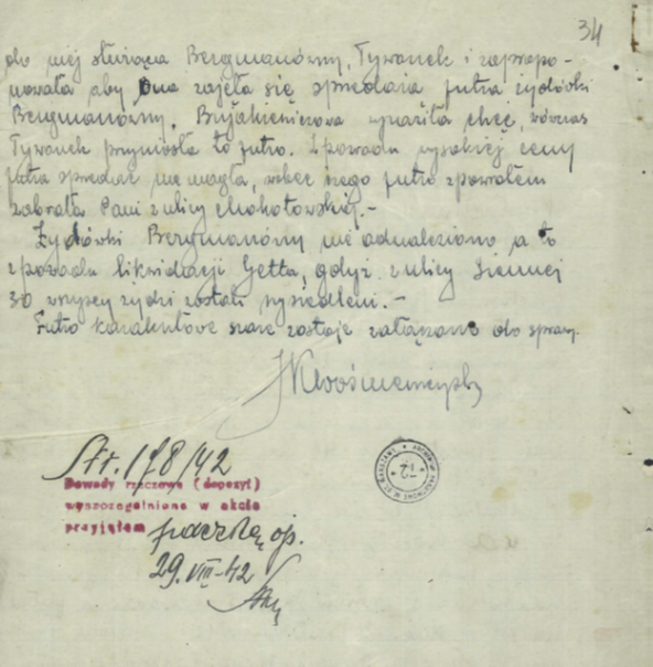 Przy licznej i niezadowolonej / rozczarowanej klienteli, nietrudno sobie wyobrazić drogę donosu na policję. Możliwe też, że Tywonek zorientowała się w potencjalnym niebezpieczeństwie lub sama znalazła nabywcę lub innego pośrednika. Na pewno zaś nie chciała stracić spodziewanego zysku i przypuszczalnie to ona wysłała w drugiej połowie czerwca 1942 r. na Marszałkowską 62 jakiegoś mężczyznę z poleceniem, teoretycznie w imieniu Berman, przeniesienia futra z powrotem na Mokotowską, skąd miał je zabrać „jakiś kuśnierz”. Tak też się stało, ale klienta uprzedziła polska policja i jak zeznała Maria Loewe „w dniu 24 VI 1942 futro zostało zabezpieczone u mnie przez policję, a w dniu 26 VI 1942 ja sama odniosłam je do Dyrekcji Policji Kryminalnej”. To w jej siedzibie na ul. Daniłowiczowskiej 3 odbyło się 10 VII 1942 r. ostatnie przesłuchanie w tej sprawie (Katarzyny Bujakiewicz). Nie przesłuchano natomiast Haliny Berman, osoby zdawałoby się kluczowej w tej sprawie. Fakt jej mieszkania w getcie nie był dla policji przeszkodą. Dopiero 10 sierpnia 1942 r. polski policjant udał się do getta, ustalając, że z kamienicy na Siennej 30 „wszyscy Żydzi zostali wysiedleni, wobec czego nie miałem możności ustalić, gdzie obecnie znajduje się Bergman [sic!] Halina z męża Chojkin”[17]. Futro karakułowe szare zostało 29 sierpnia 1942 r. dołączone do akt sprawy i przekazane do depozytu pod numerem 178/42.
