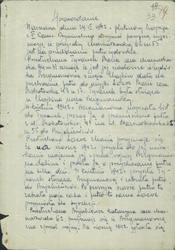 Deklarowane „chwilowe przechowanie” przeciągnęło się jednak do kwietnia 1942 r. Trudno powiedzieć dlaczego – czy Bermanowie mieli jeszcze jakieś zasoby i sprzedaż futra odkładali z nadzieją na zwyżkę cen, może stracili kontrolę nad swoim mieniem, co było w takich przypadkach częste. Zastanawia też włączenie (się?) do akcji Marii Tywonek, młodszej, obrotniejszej, utrzymującej się z handlu. Jej rolę może też podkreślać fakt, że jako jedyna z kilku przesłuchiwanych Polek, została 26 czerwca 1942 r. zatrzymana w areszcie. Następnego dnia zeznała, że „W kwietniu 1942 r. dostała list od Bermanówny z prośbą o przeniesienie futra na ul. Marszałkowską 62 m. 55 do Bujakiewiczów, którzy mieli je sprzedać. Ja za te czynności miałam otrzymać prowizję, a gotówkę zanieść do Sądów Grodzkich na ul. Ogrodową, gdzie odebrałaby Bermanówna. Dalej tym futrem nie interesowałam się i czy zostało sprzedane nie wiem. Z Bermanówną nie kontaktuję się”[15].