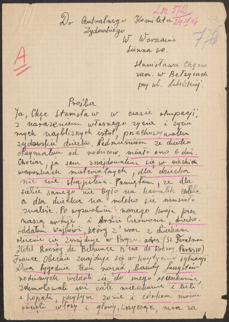 Żydowskiego Instytutu Historycznego, w zbiorze Wydziału Opieki Społecznej Centralnego Komitetu Żydów w Polsce (303/VIII), gdzie znajdują się prośby o pomoc materialną składane przez Polaków, którzy pomagali Żydom.
