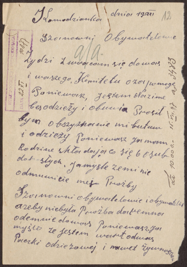 (List z 24 marca 1947, AŻIH 303/VIII/224, k. 111).I jeszcze list od Stanisława Oleszka ze wsi Komodzianka w województwie lubelskim, który już wcześniej pisał do Komitetu: „(…) Jestem Nazime besodzieży i obuwia. Prosił bym o bszyznanie mi butuw i odzieży (List z 19.11 [1947], AŻIH 303/VIII/234, k. 12). (…) jest mi bardzo przykro, że jestem cieszko pogrążony bes Bandy, żone moim kaleke, bozostała strasznie została pobita, i ręką ubita i zabrali mi bandyci konia i 2 wiepsze, i wós spowodu Żydum, żem czszymał i nieras chcieli mnie zabić ale niestety stale. Uciekłem z dumu, bo wiedziałem żejak mie znajdą to mnie zabiją tyko cierpiała sama żona, również i mnie teraz jeszcze wołają Żydzie”